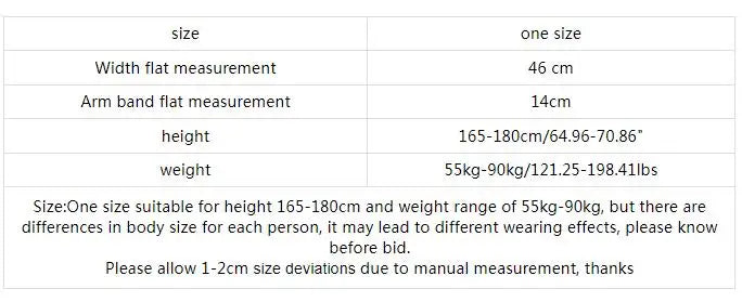 Size:One size suitable for height 165-180cm and weight range of 55kg-90kg, but there are differences in body size for each person, it may lead to different wearing effects, please know before bid.
